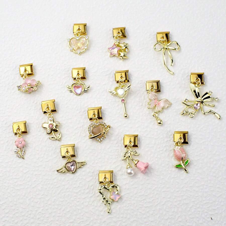 1 pieza Módulo de pulsera de diamantes únicos de moda personalizada con dijes de tulipán, lazo, corazón, flor, estrella y perla en oro
