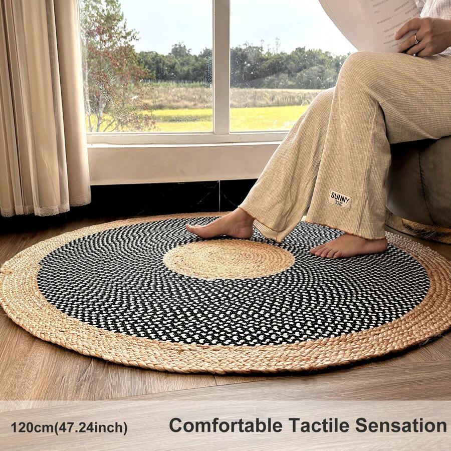 1 PIEZA Alfombra redonda de yute natural tejida a mano con estilo bohemio, Alfombra redonda trenzada de yute para sala de estar, dormitorio, cocina, color negro, alfombra de decoración rústica, apta para mascotas, decoración del hogar moderna de 3/4 pies, para Acción de Gracias y