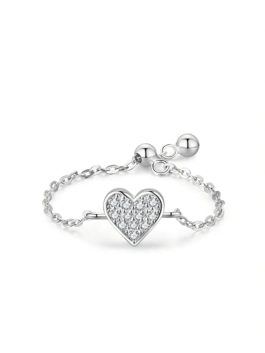 1 pieza Anillo de cadena apilable ajustable de corazón de plata de ley 925 para mujeres, joyería clásica de boda
