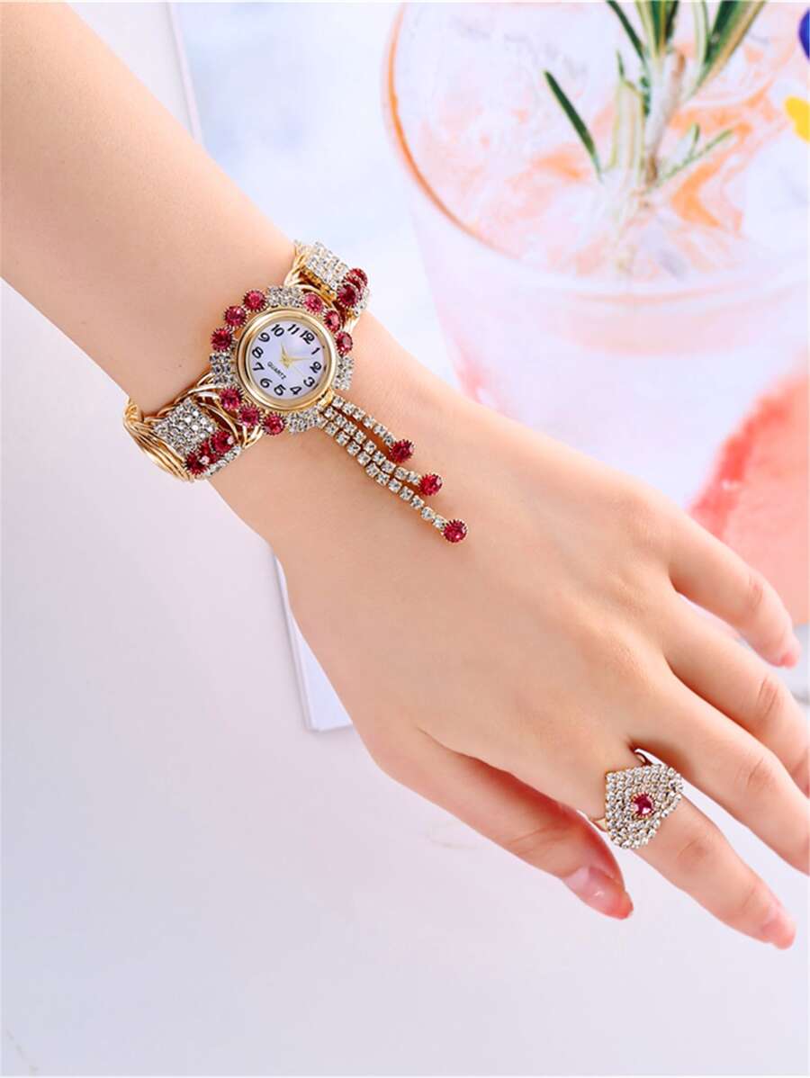 1 pieza Reloj de cuarzo con decoración de rhinestone y 1 pieza Anillo como regalo para estudiantes que regresan a la escuela