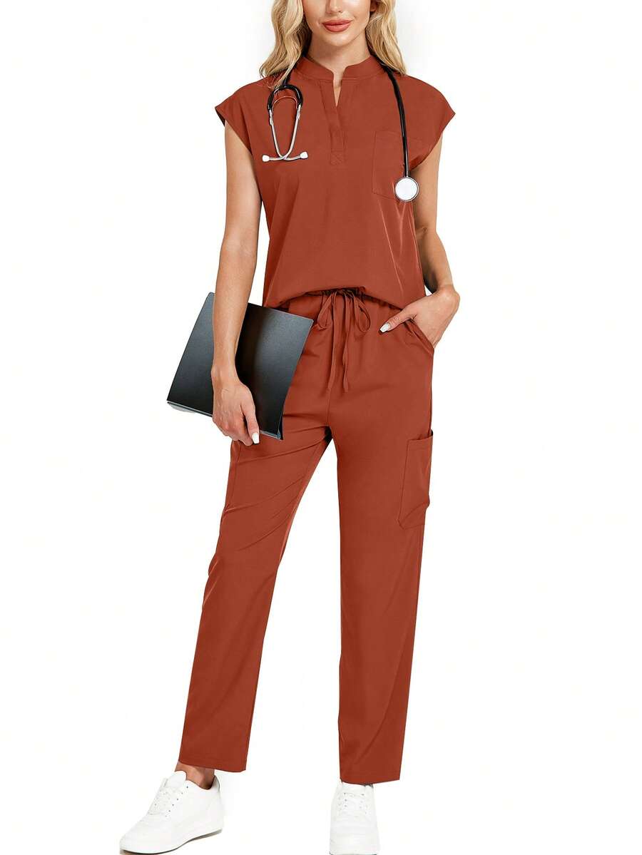 2 piezas Conjunto de uniforme de scrubs de unicolor con top de cuello en V de manga corta y pantalones con bolsillos