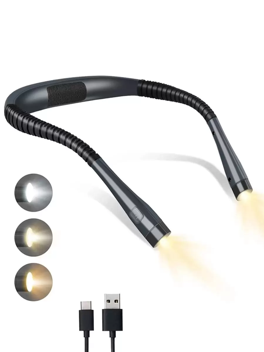 Luz de lectura LED para cuello de 1 pieza, 3 colores, 6 niveles de brillo, luz de libro recargable para leer en la cama, brazos flexibles, para tejido, campamento, reparaciones