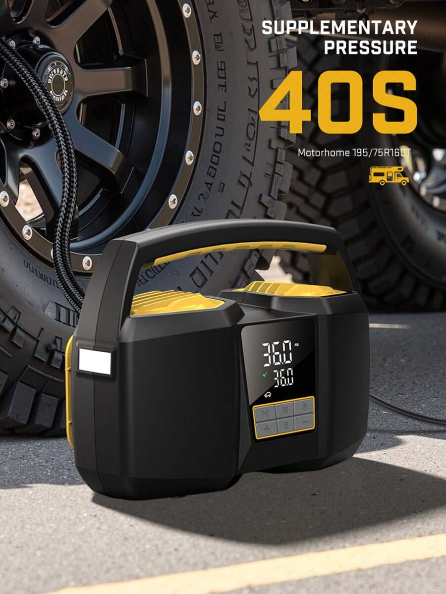 Inflador de neumáticos Carsun, compresor de aire portátil, bomba de neumáticos, cilindro doble de 25, modelo con pantalla digital de 12V-CC, tecnología mejorada (bajo nivel de ruido), 180W de alta potencia, 3 veces talla grande rápida la velocidad de inflado, apagado automático, accesorios para automóvil - adecuado para autocaravana, camión, SUV, balones deportivos y talla grande