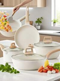 Juego de ollas antiadherentes de 7 piezas, de cerámica antiadherente, de granito. Libre de PFAS, PFOA, plomo y cadmio. Ligero, de calentamiento rápido y uniforme, fácil de limpiar, ultrarresistente, con asas extraíbles de imitación de baquelita. Versátiles ollas de granito aptas para todo tipo de cocinas, incluyendo inducción, gas, eléctricas y vitrocerámica. Diseño apilable o encajable. Se guardan fácilmente en armarios o cajones. Ideales también para camping y viajes en autocaravana#3 Más vendidos