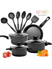 Juego de ollas de 30 piezas, juego de utensilios de cocina de aluminio antiadherentes de 30 piezas (con guantes), juego de ollas, juego de utensilios de cocina, que incluye cuatro tamaños diferentes de ollas, todas con tapas de vidrio transparente, varias formas de sartenes y bandejas para hornear, tapetes para ollas y guantes aislantes del calor para evitar quemaduras, el revestimiento antiadherente no requiere el uso de mucho aceite o mantequilla, reducción de grasa saludable,#6 Más vendidos
