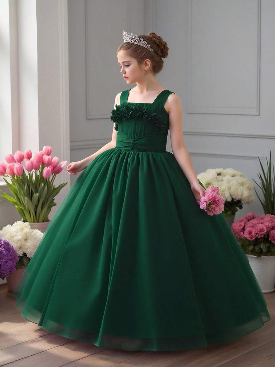 Vestido formal largo elegante de malla con flores 3D de unicolor para niñas preadolescentes, adecuado para fiestas y eventos, sin diadema