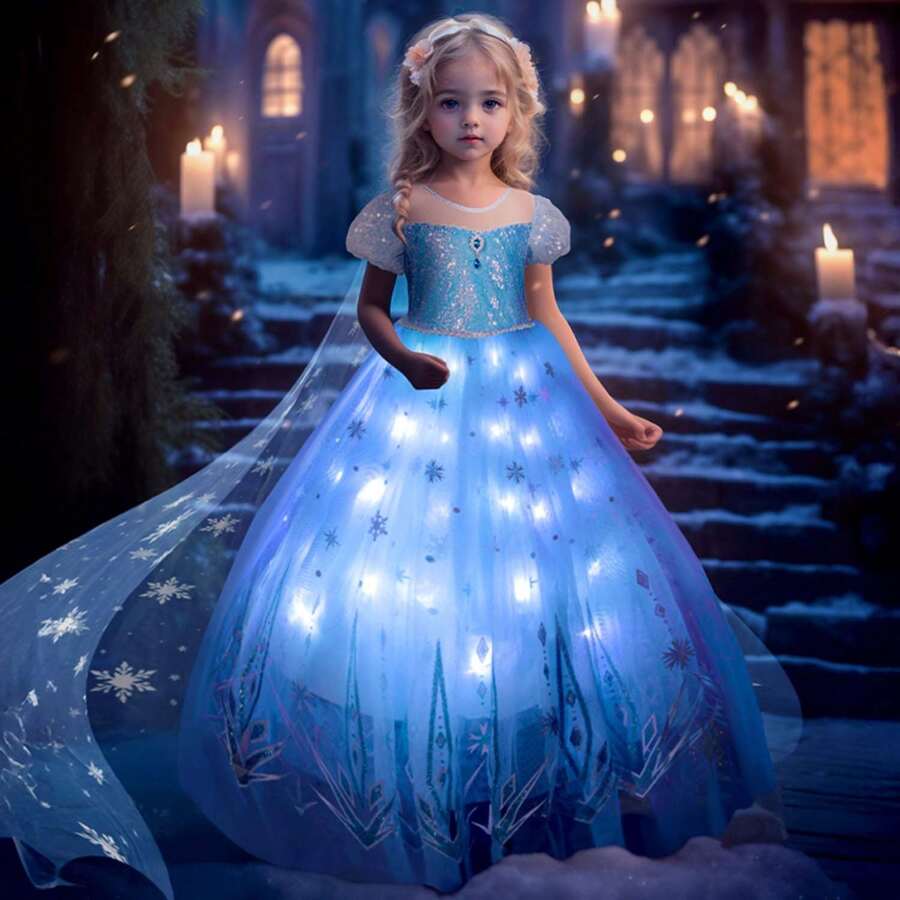 UPORPOR Vestido de princesa con luz LED para niñas, ropa de disfraz de princesa con capa azul (Baterías no incluidas)