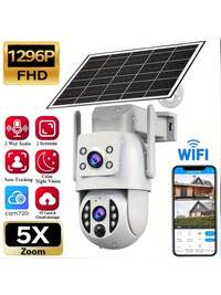 Cámara de con zoom 5X de 3MP y doble lente, alimentada por energía solar, WiFi de 2.4GHz, resistente al agua para exteriores, detección de movimiento humano, foco con seguimiento de movimiento, visión nocturna a color, audio bidireccional, con panel solar, bajo consumo, rotación de 355° horizontal y 90° vertical, detección de IA, horizontal/vertical/zoom (tarjeta de memoria de 64GB se vende por separado, cámara solar no incluida) #1 Más vendidos