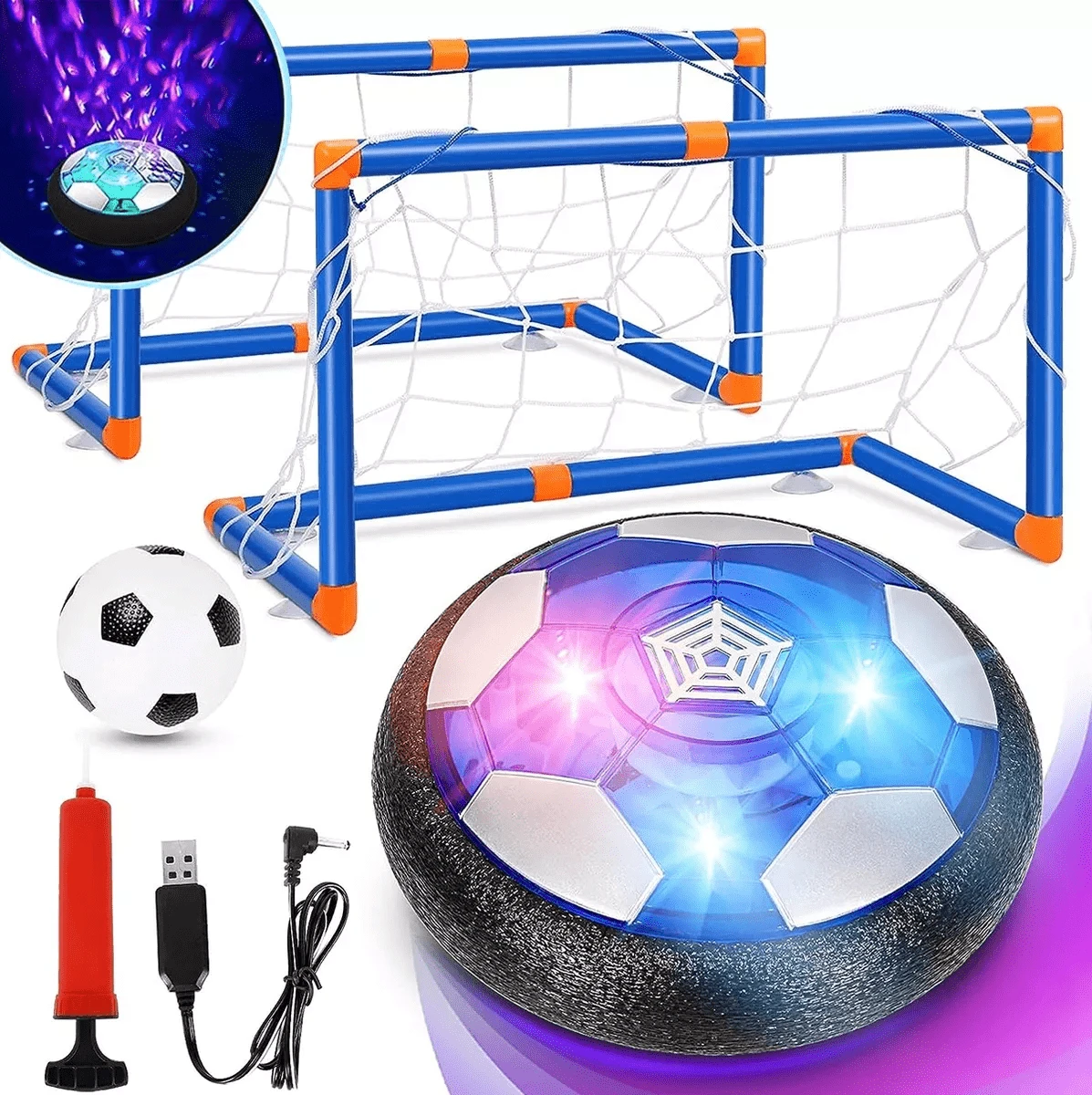 Portería de fútbol deportiva Juego de porterías de fútbol para niños 6 piezas, dos porterías, un cable de carga, un balón luminoso, una bomba hinchable, un balón hinchable, apto para interior y exterior, juguetes educativos