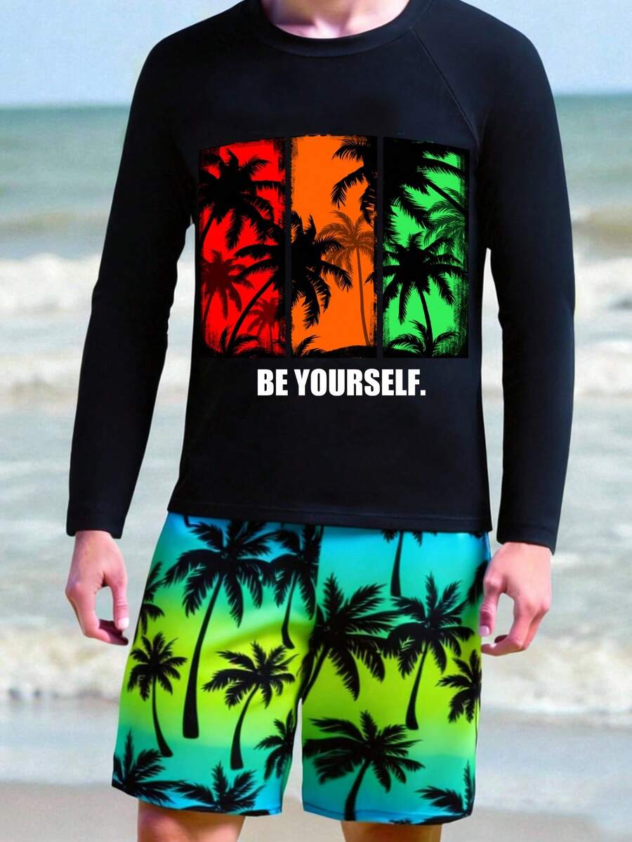 SHEIN Conjunto de tankini de 2 piezas con estampado de árbol de coco que brilla en la oscuridad para niño preadolescente, adecuado para primavera/verano, vacaciones en la playa