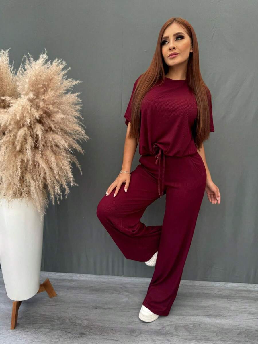 Conjunto de dos piezas de top y pantalón largo de manga larga informal para mujer con bolsillos y tejido elástico medio.