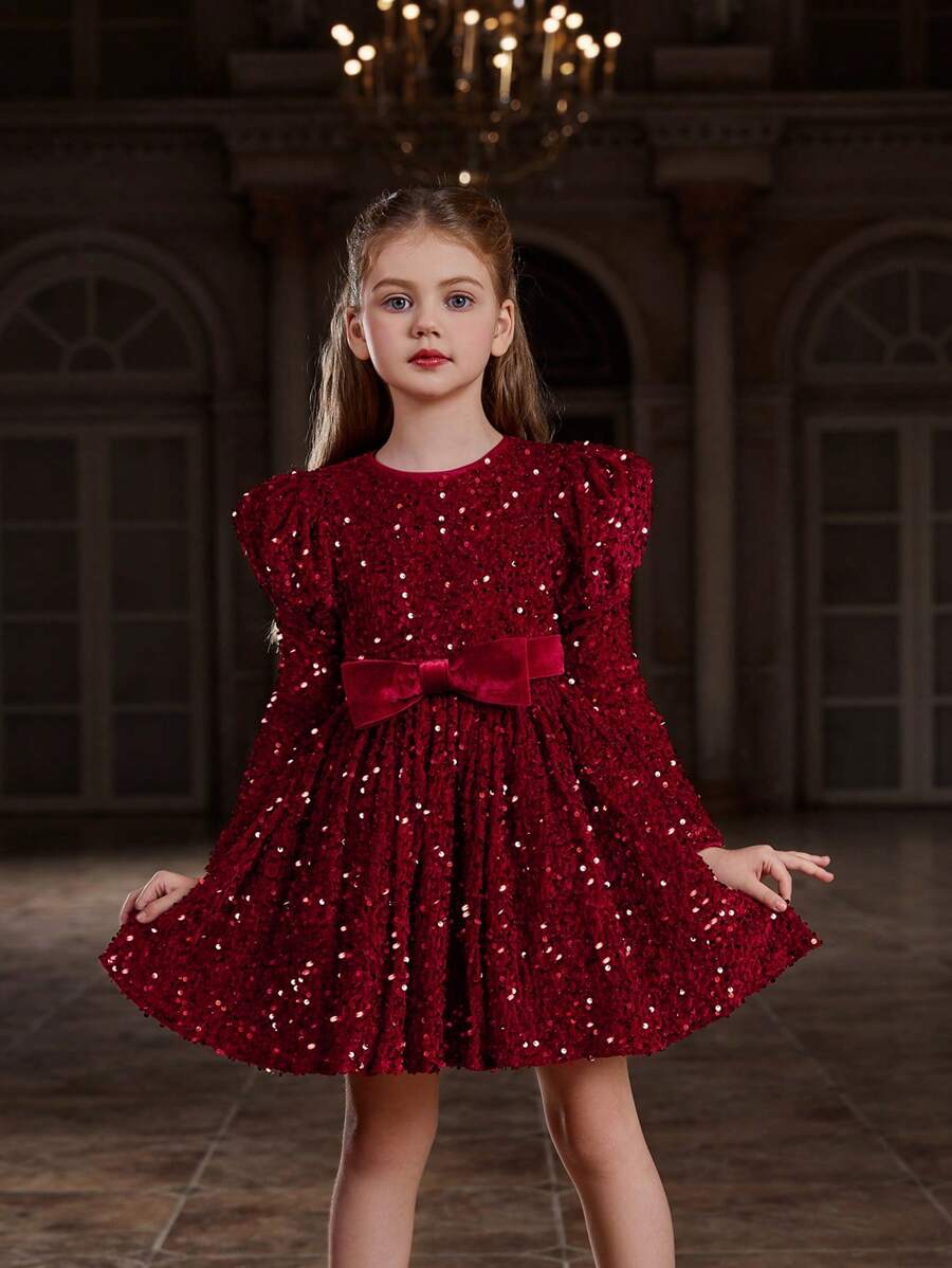 Vestido de cuello halter con brillo para niña preadolescente con mangas con volantes y decoración de lazo