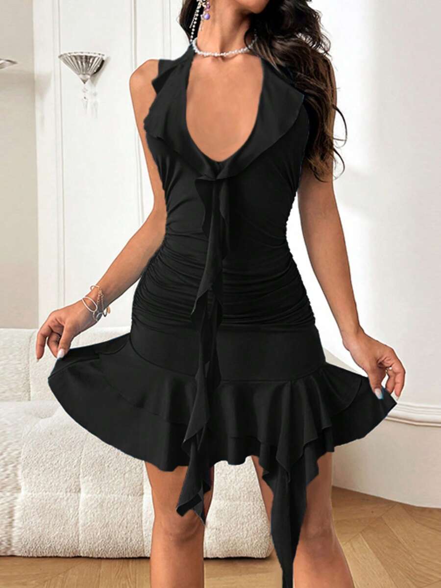Vestido corto con cuello halter, espalda descubierta y volantes para mujer, para otoño de la marca WOWDARK