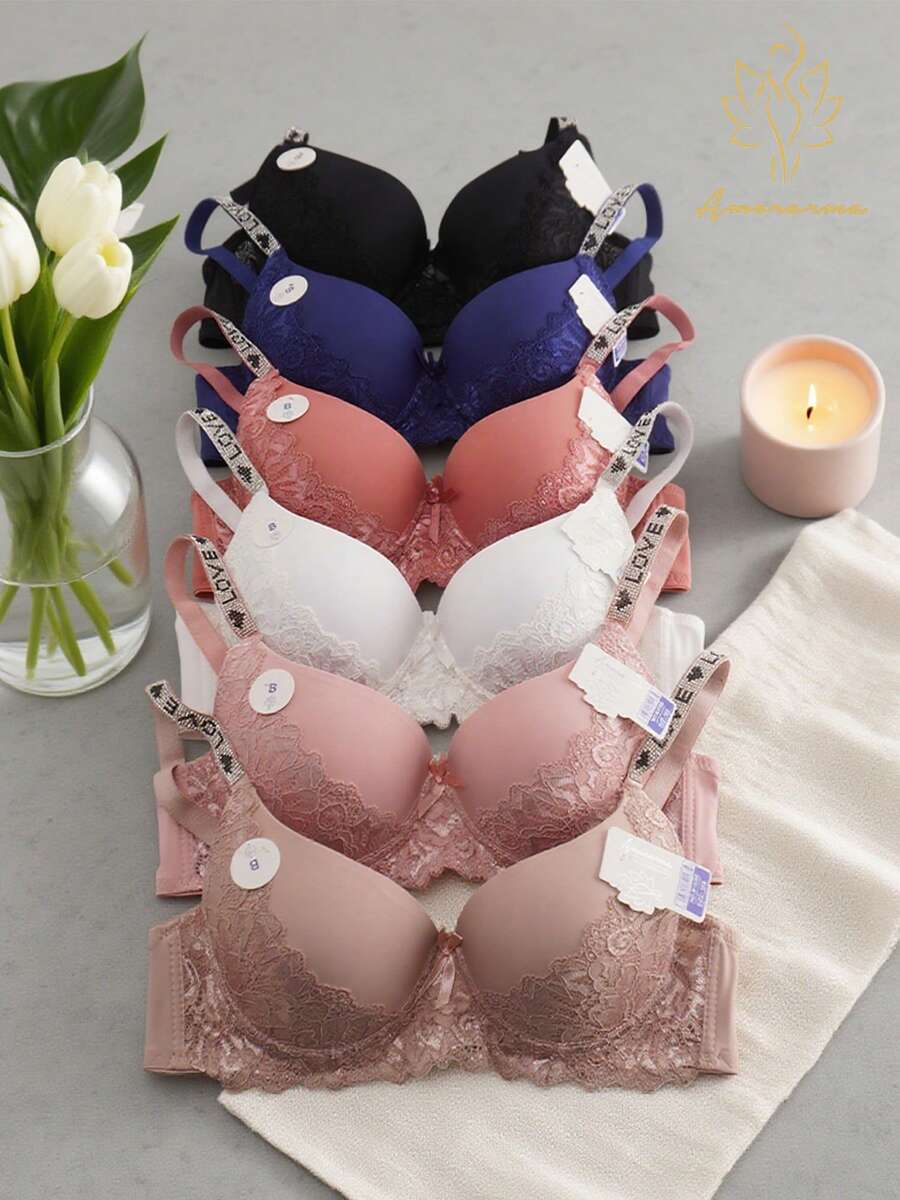 6 pairs Sujetadores para mujer de copa B, Sujetador diario suave, sin costuras ni marcas, cómodo,Conjunto de 6 sujetadores de mujer en 6 colores diferentes, con detalles de encaje y tiras ajustables decoradas con letras y strass.