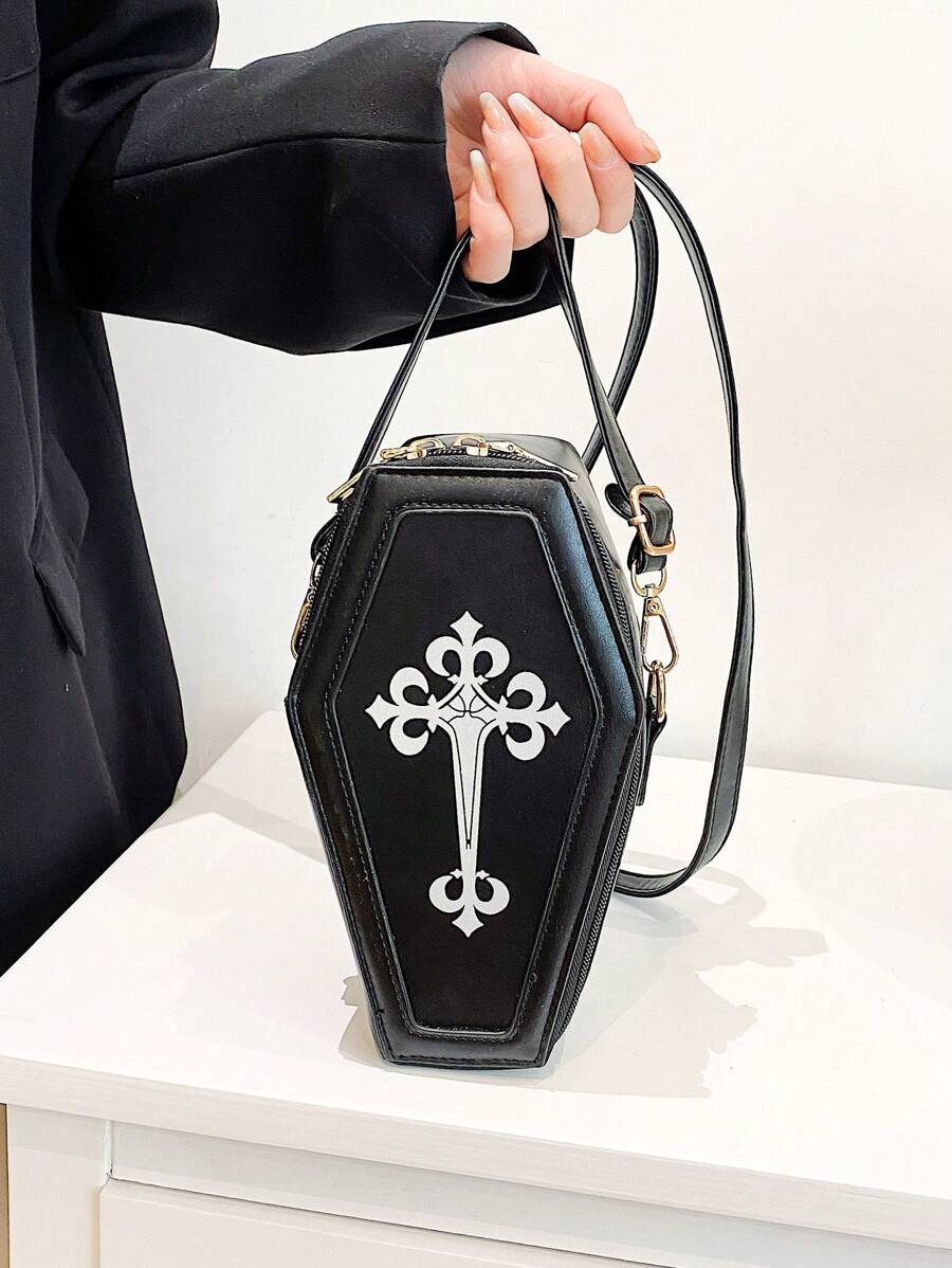 Bolso Con Forma De Ataúd Gótico Para Mujer, Bolso De Hombro Pequeño Para Teléfono Celular Con Estilo Y2k, Bolso Cruzado Novedoso Para Fiestas Y Viajes, Con Patrón De Cruz Punk De Moda Y Cinturones De Cintura Para Compras Y Viajes