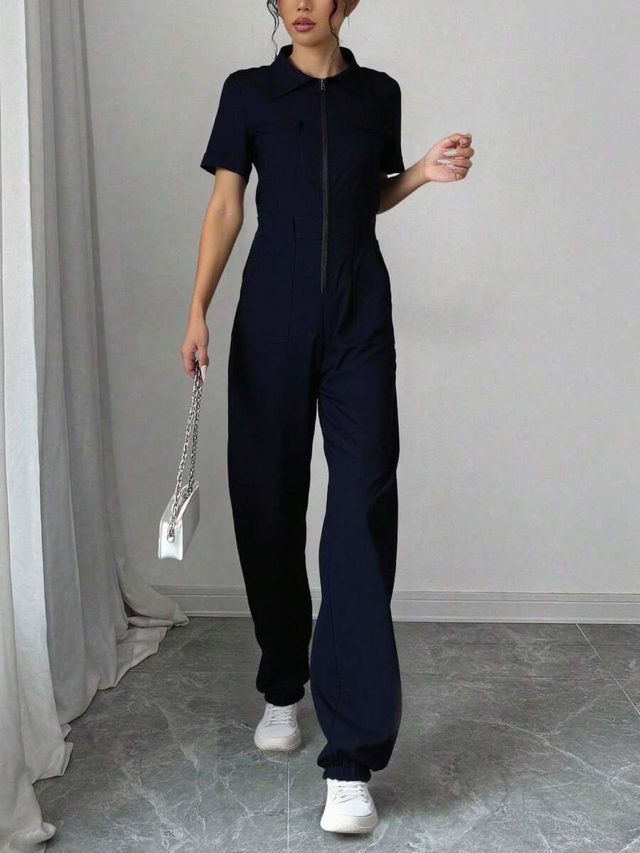 Nuevos pantalones de trabajo para mujer para el otoño y el invierno, para una elegancia informal en el día a día. Mujer jumpsuit estilo moderno con cierre, ajuste holgado, cuello tipo camisa, manga corta, primavera-verano, ideal para uso diario, categoría de moda.