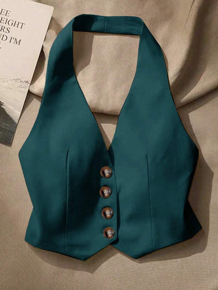 Camiseta de tirantes sin mangas de un solo pecho de unicolor y cuello de halter, versátil y de moda para mujeres