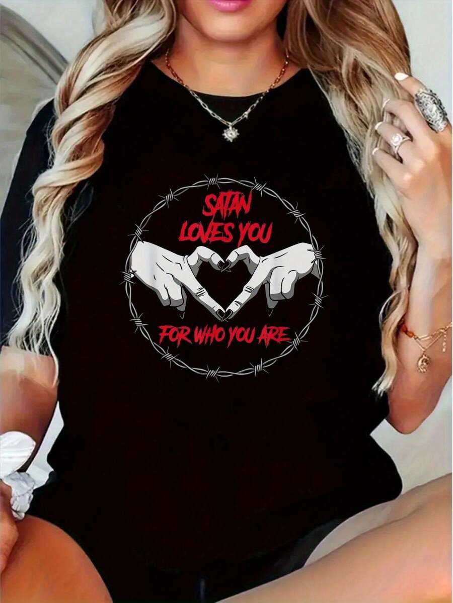 Camiseta Gráfica Y2K para Mujer - Estampado en Contraste SATAN LOVES YOU & por QUIÉN ERES - Top de Cuello Redondo y Manga Corta - 220g Ropa Casual Todo-Tiempo, Transpirable, Moda Cómoda