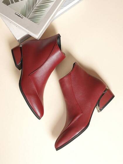1 par de botas de tobillo con punta puntiaguda color borgoña para adolescentes, tacón bajo grueso metálico, cremallera lateral, minimalista y cómoda, botas de moda versátiles para estudiantes y fiestas