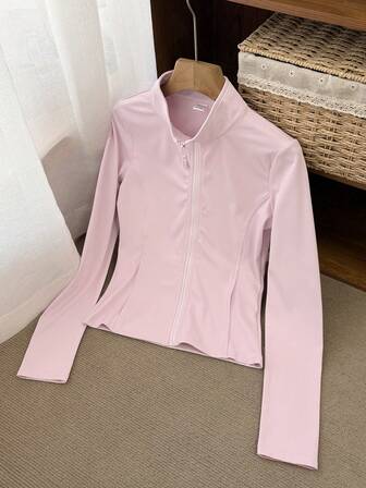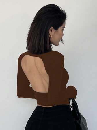 DAZY Camiseta de manga larga de cuello alto ajustada y sin espalda para mujer