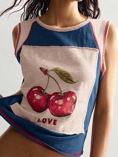Bohemela Camiseta de tirantes de mujer casual con cuello redondo ajustado, estampado de frutas y contraste de color, camiseta de verano sin mangas con gráfico de cereza