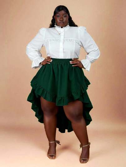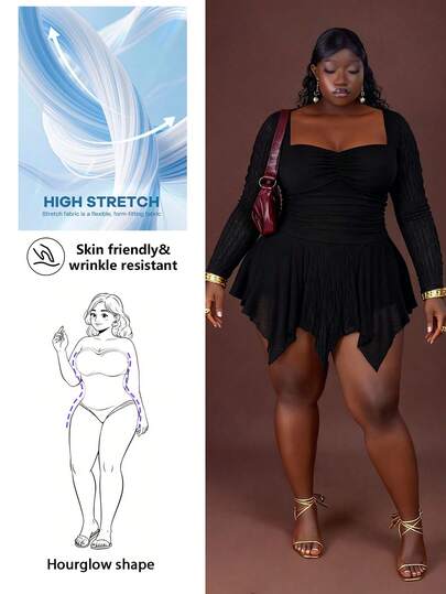 Hourglow Vestido de moda de manga larga con cuello redondo y volantes en el bajo, unicolor, talla grande, para figura de reloj de arena y de ampulosa, 2026 Año Nuevo