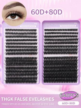 640 piezas Kit de pestañas en racimo - Rizado 60D + 80D 8-16mm Longitud mixta, Volumen natural y esponjoso Extensiones de pestañas postizas de visón DIY reutilizables, plumas e hipoalergénicas (para principiantes) para uso en bodas/fiestas/diario