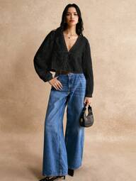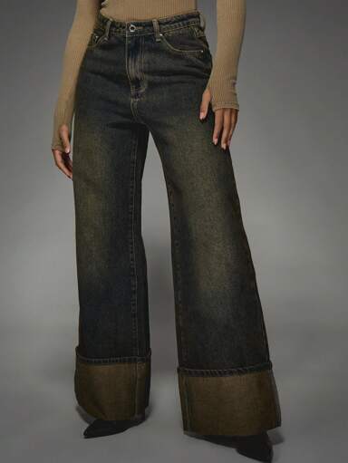MISSGUIDED Pantalones vaqueros de pierna ancha con dobladillo ancho, cintura alta, lavado vintage, fondo de mezclilla, retro acampanado, cómodo para otoño e invierno, dobladillo ancho con doblez casual