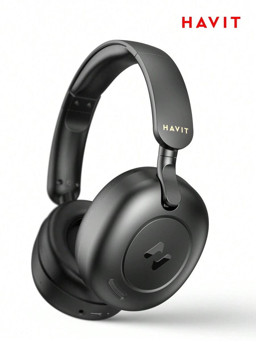 havit Auriculares híbridos H655BT a prueba de ruido activo para viajes en avión, auriculares inalámbricos Bluetooth sobre la oreja, 76H de tiempo de reproducción, audio de alta resolución, súper graves a través de la aplicación, 5 micrófonos para reducción de ruido