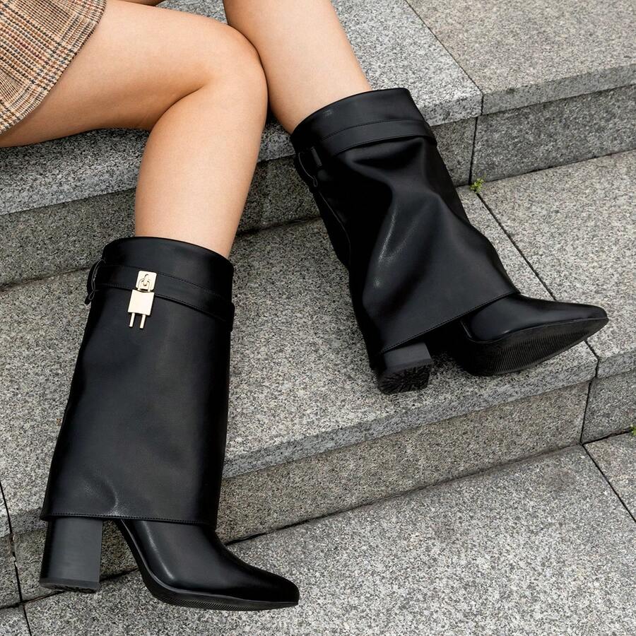 WEIDE Botas de tacón alto para mujer – Botines negros de invierno con puntera puntiaguda y diseño de caña, cómodos y a la moda para salidas y actividades al aire libre