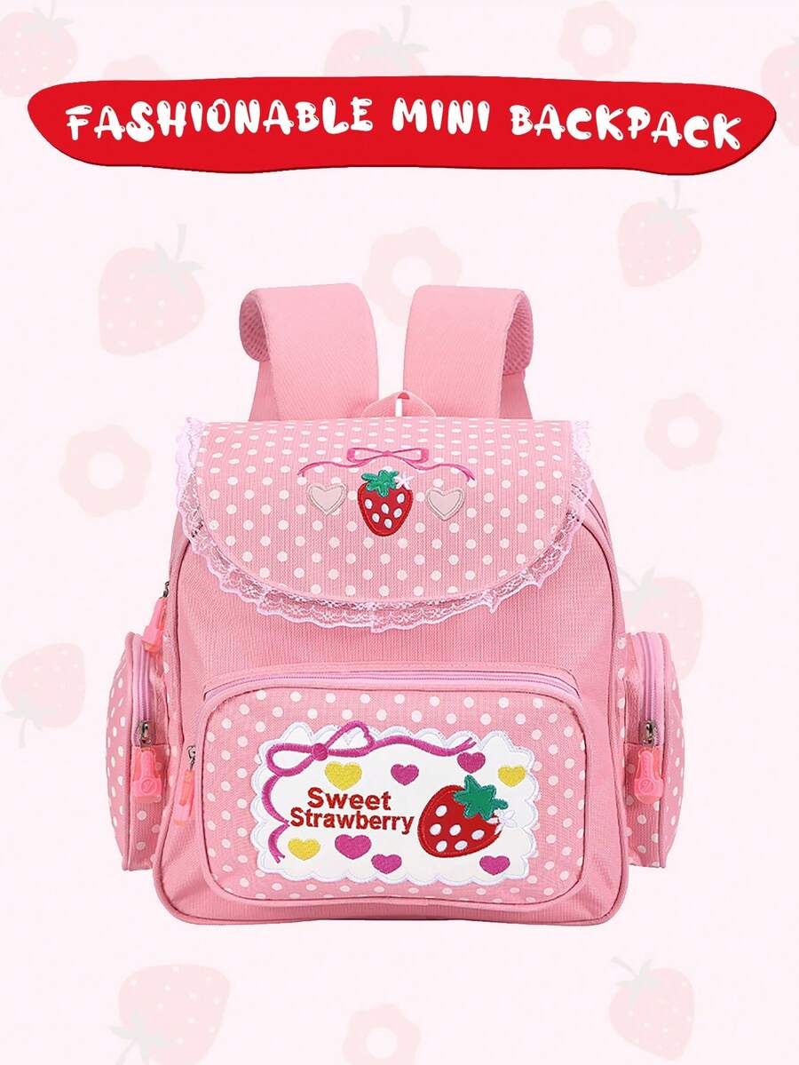 Mochila bordada con diseño de fresa, mochila rosa dulce con bordado de fresa, mochila escolar bordada con frutas y encaje para niña