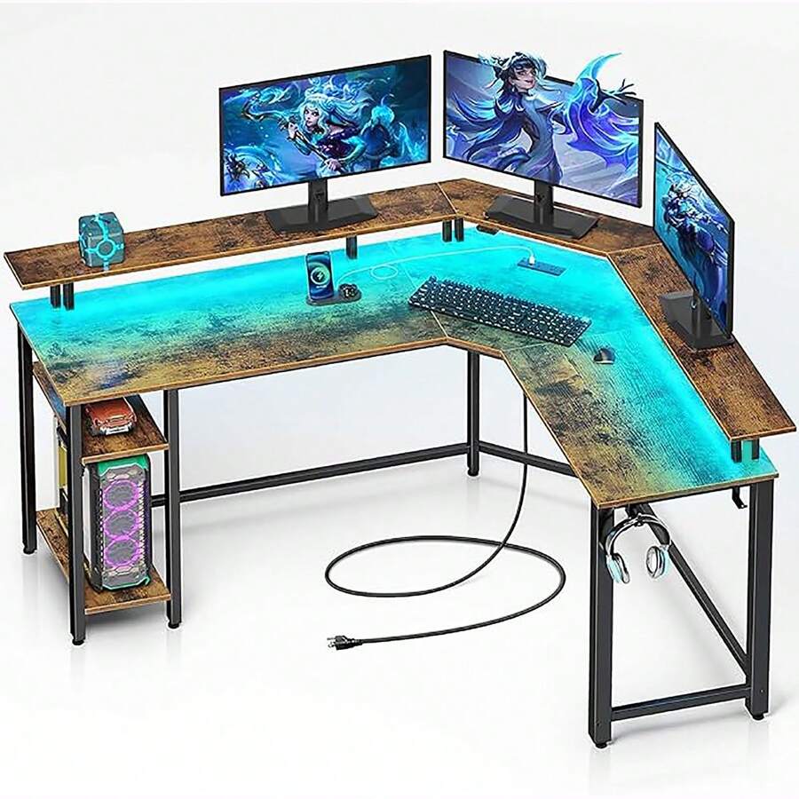 Muebles Escritorios Metalico Oficina Con Enchufe Y Gancho,Computer Corner Desk with Monitor Shelf for Home Office Study Writing Workstation,Corner Gaming Computer Desk with Led Lights, Monitor Shelf and Printer Storage Shelves