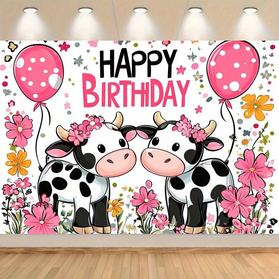 1 pieza Fondo de fiesta de cumpleaños con tema de vaca adorable | Poliéster con vacas de dibujos animados encantadoras, flores rosas y diseño "Feliz Cumpleaños" | Excelente para cabina de fotos y decoración de mesa de pastel, banderín, tapiz, decoración de habitación, decoraciones de fiesta de cumpleaños
