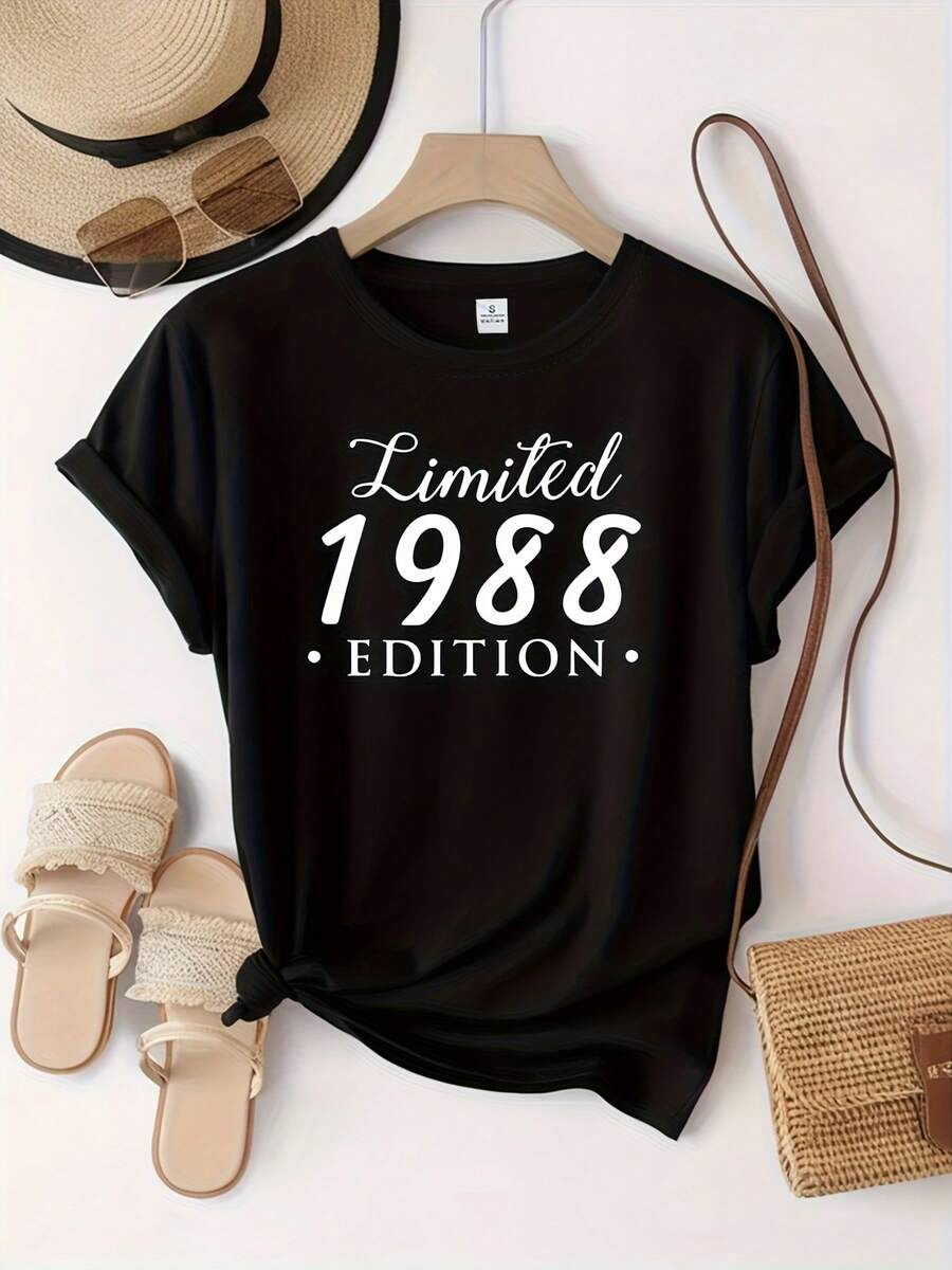 Camiseta gráfica negra para mujer de edición limitada de 1988, camiseta de manga corta con cuello redondo de algodón de 180 g, idea de regalo de cumpleaños de estilo vintage, ropa casual diaria para damas, tela suave y transpirable de moda, estampado de año retro, top de moda de ajuste clásico